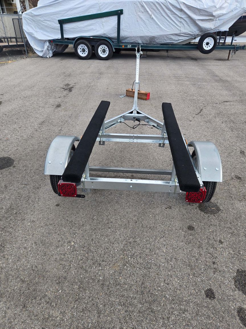 Offers a longer tongue and larger tires than the 48810. This trailer includes everything needed to carry a small boat, inflatable, or PWC up to 14' long. The multi-sport plus trailer's frame is built to carry up to an 800 lb load and includes DOT approved lights, a pair of 5' adjustable carpeted bunk boards with dual adjustable support, winch stand, winch hook and strap, and a hitch coupler with safety chains. The 4.80 x 12" tires are rated for use at highway speeds, and the winch stand can be mounted anywhere along the 86" tongue to balance the load because a properly balanced load is critical for safe trailering. Total overall length 156", overall width 54" RETAIL $2257.00