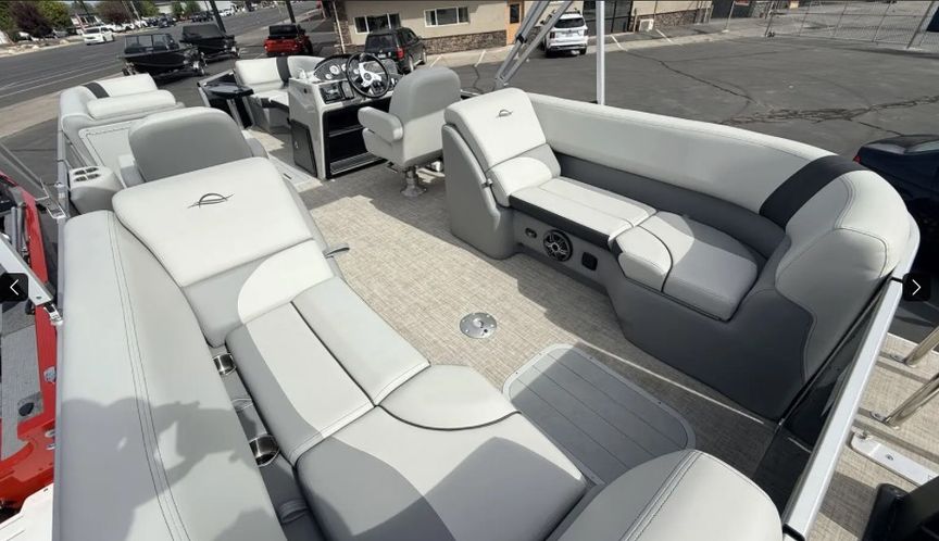 - High-Quality Build & Attention to Detail: • Roto-molded furniture with rain-drain channels under cushions (keeps everything dry & clean) • Wrap-around lounges with under-seat storage—plenty of room for gear, coolers, toys, towels • Heavy-duty logs (23″×25″ “Jumbo” performance logs) with closed-cell flotation foam—solid flotation and stable ride • Wide-body design (8’6″ beam), premium deck & structural support (deck extrusions, through-bolts)—built for durability & smooth water time. • Comfort & convenience: Tilt steering, power assist hydraulic steering in higher trims, deluxe lounge layouts, built-in cooler under the bow corner, mood & courtesy lighting, full boarding ladder.