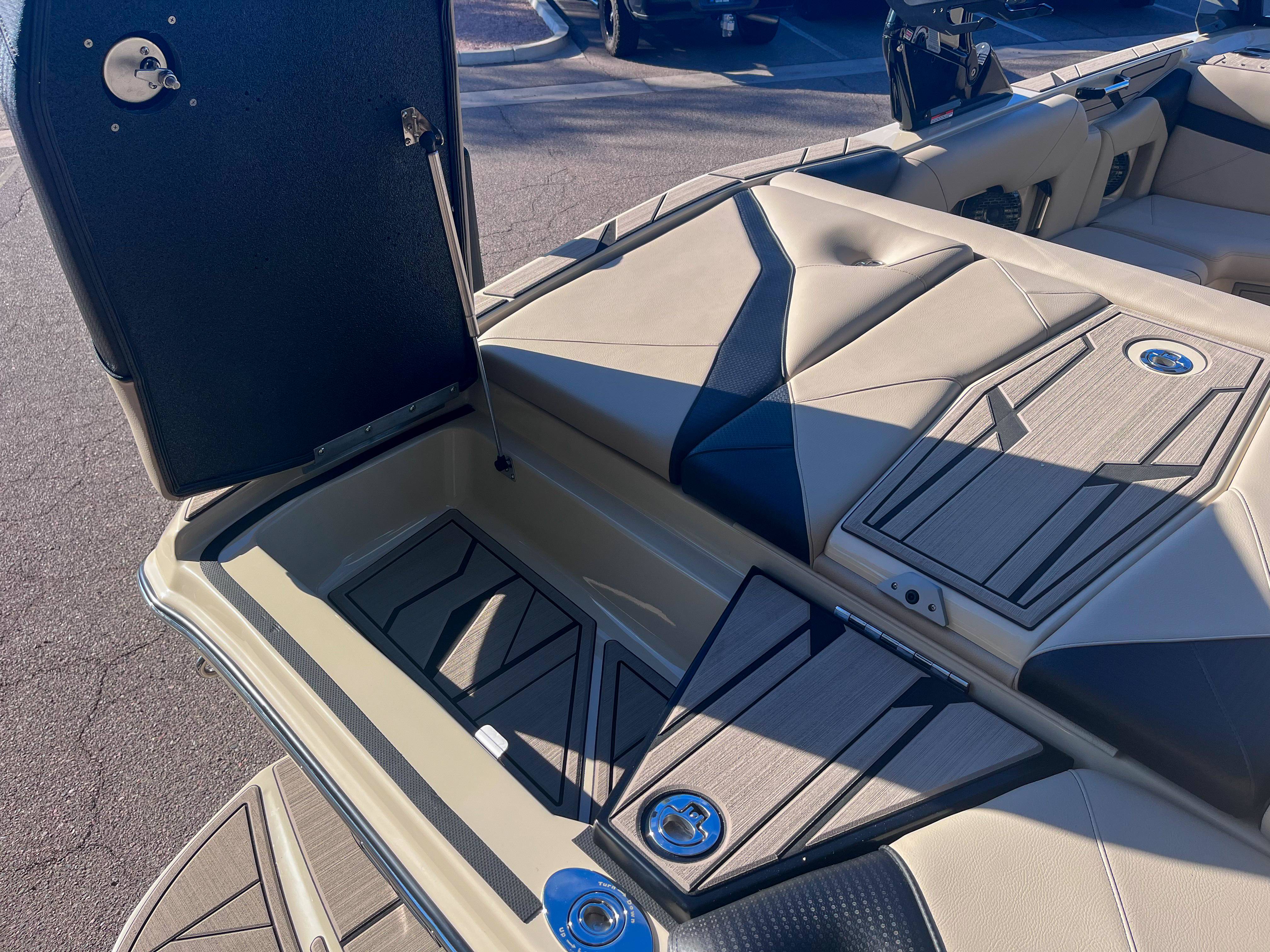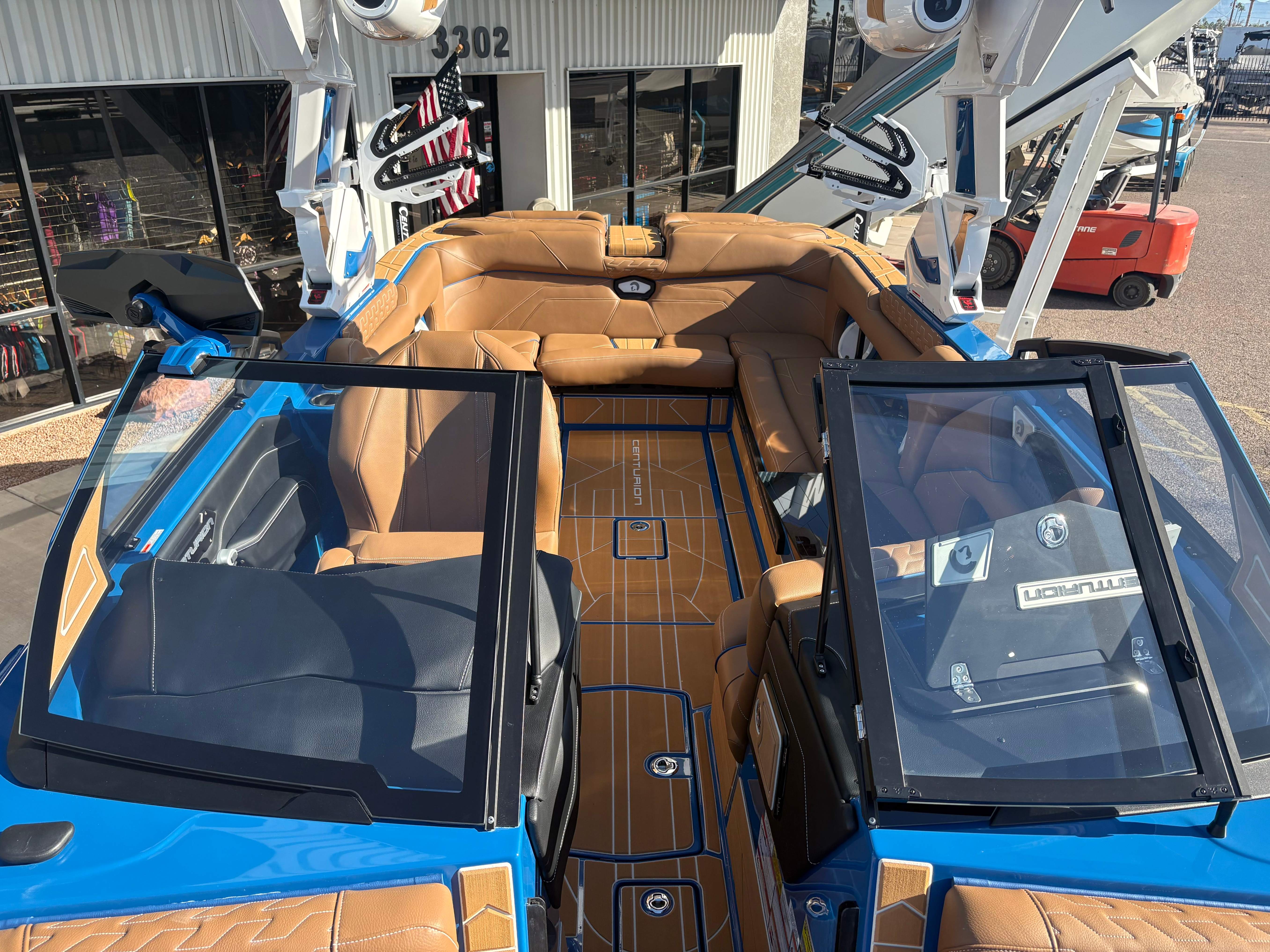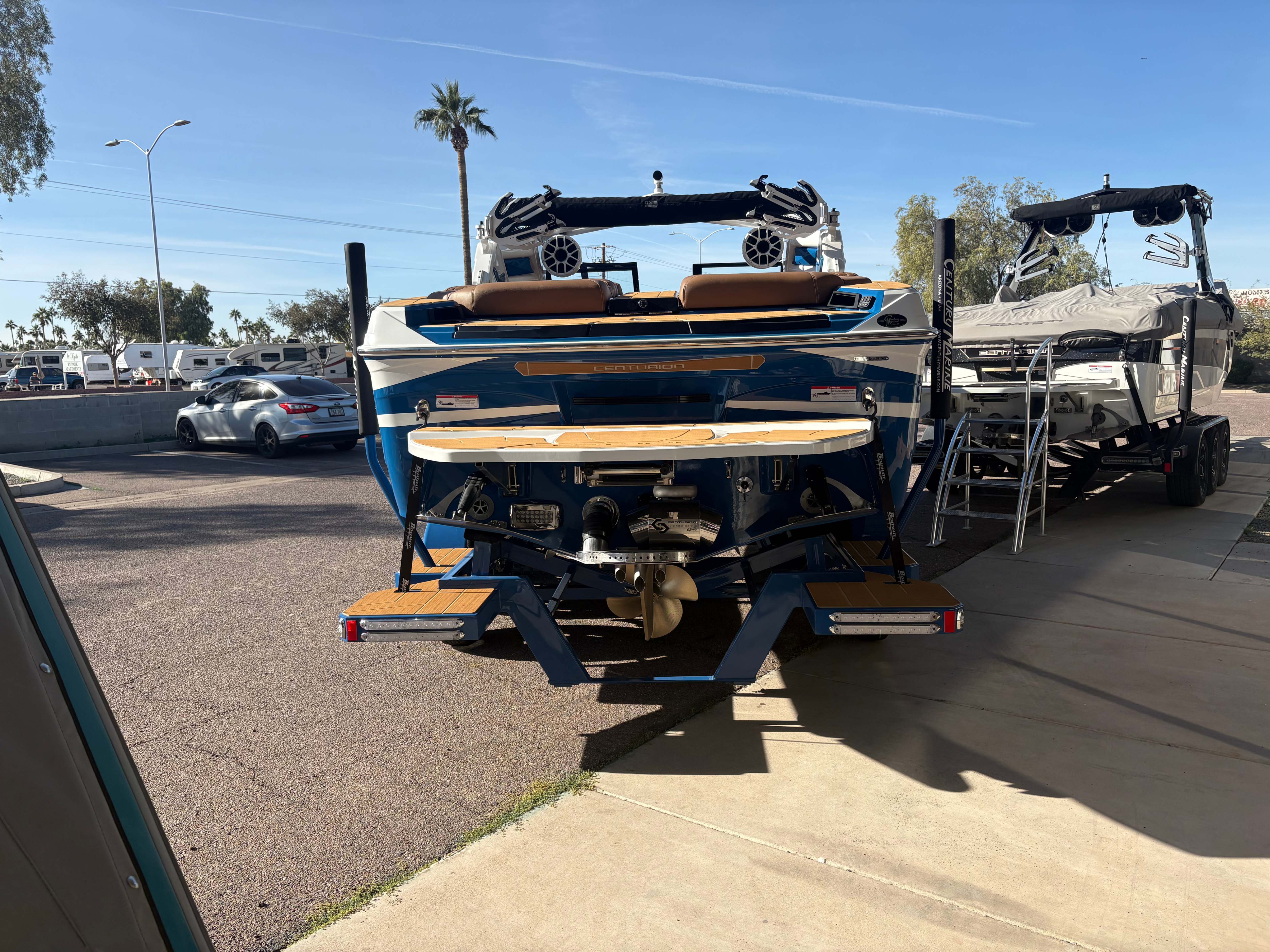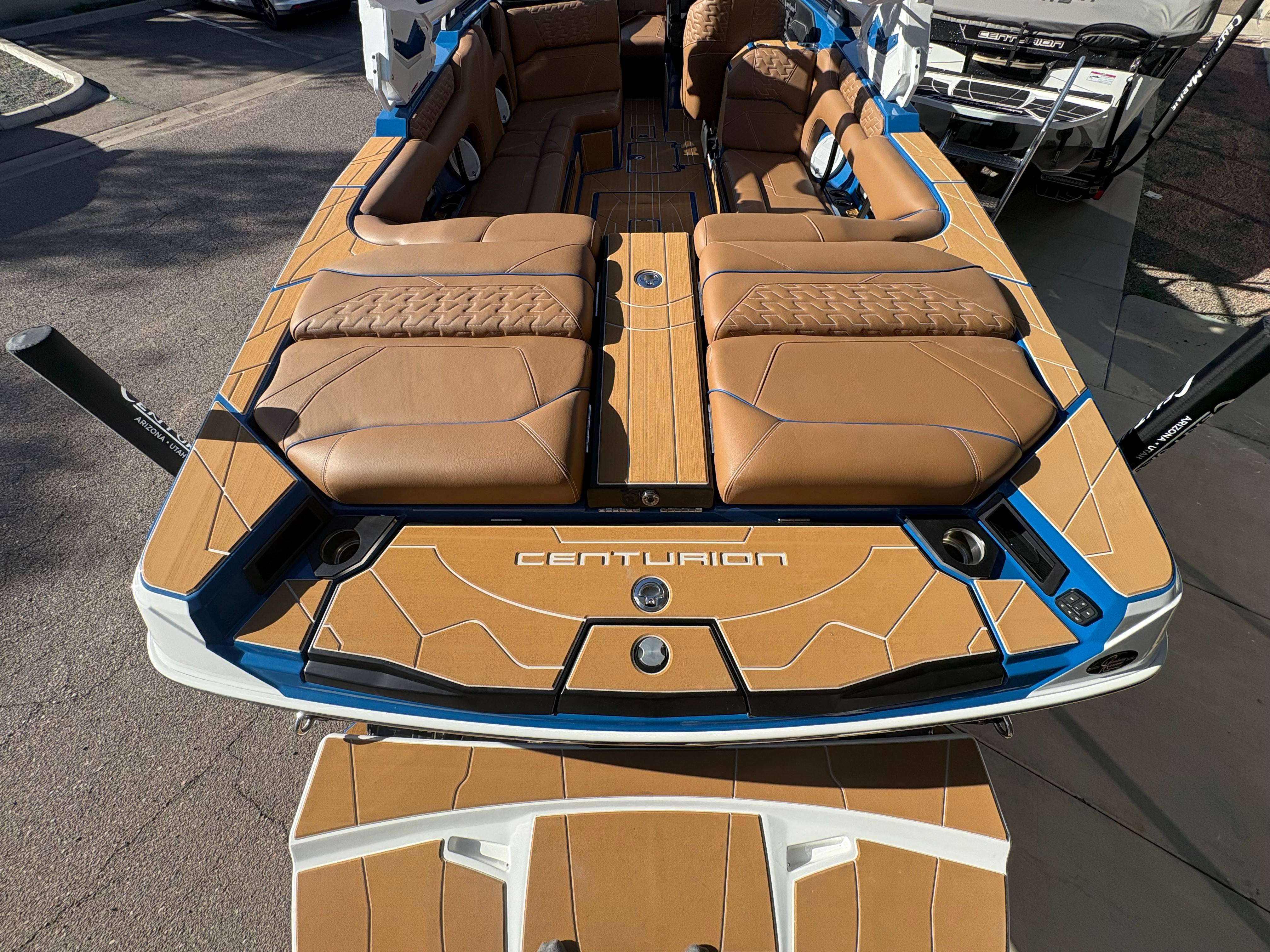 2026 Centurion Ri245 - Marina Blue/Castano Brown The Ri245 hits the sweet spot for advanced wave and wake sports enthusiasts with a 24.5’ powerhouse that excels in performance and comfort. Features: - Up to 5,400 LBS of ballast - Powered by PCM ZZ6 6.2L engine - Surge Thruster - Predator Power Folding Tower -Sewlong Bimini - Ram Fill 2.0 technology for rapid ballast filling and draining - Efficient fuel consumption with live fuel economy readouts - Transom Remote - 6 Way Power-Adjustable Seat -Flip up Interior Seating - Bombshell 2.0 Strapless Board Racks - Flip Up Interior Port Stadium Seating - Interior and Underwater RGBW Lights - Triple Axle Trailer -Front Boarding Ladder w/ Handrails GENERAL SPECS Length: 24.5' Beam: 102" Factory Ballast: 5,650 lbs. Draft: 36" Fuel Capacity: 89 gal Weight: 5,700 lbs Weight on Trailer: 7,300 lbs Seating Capacity: 16 People + Max Ballast Century Marine : (480)-835-9134 3302 E Main St Mesa, AZ 85213