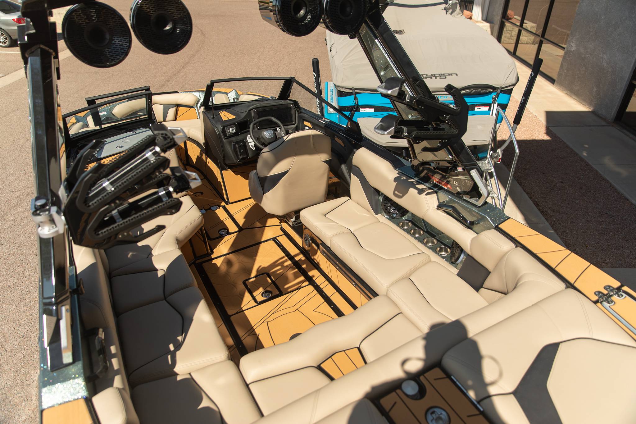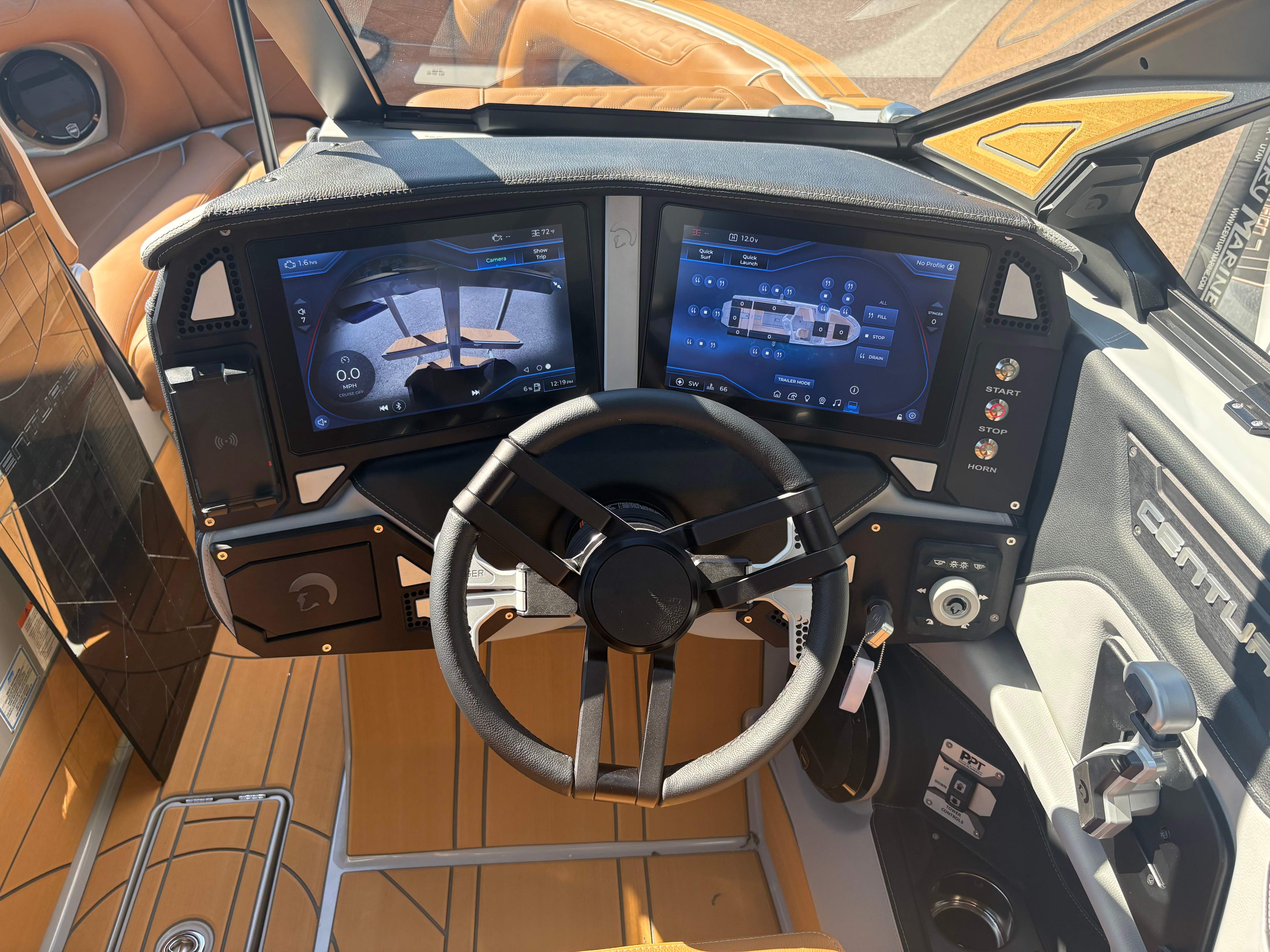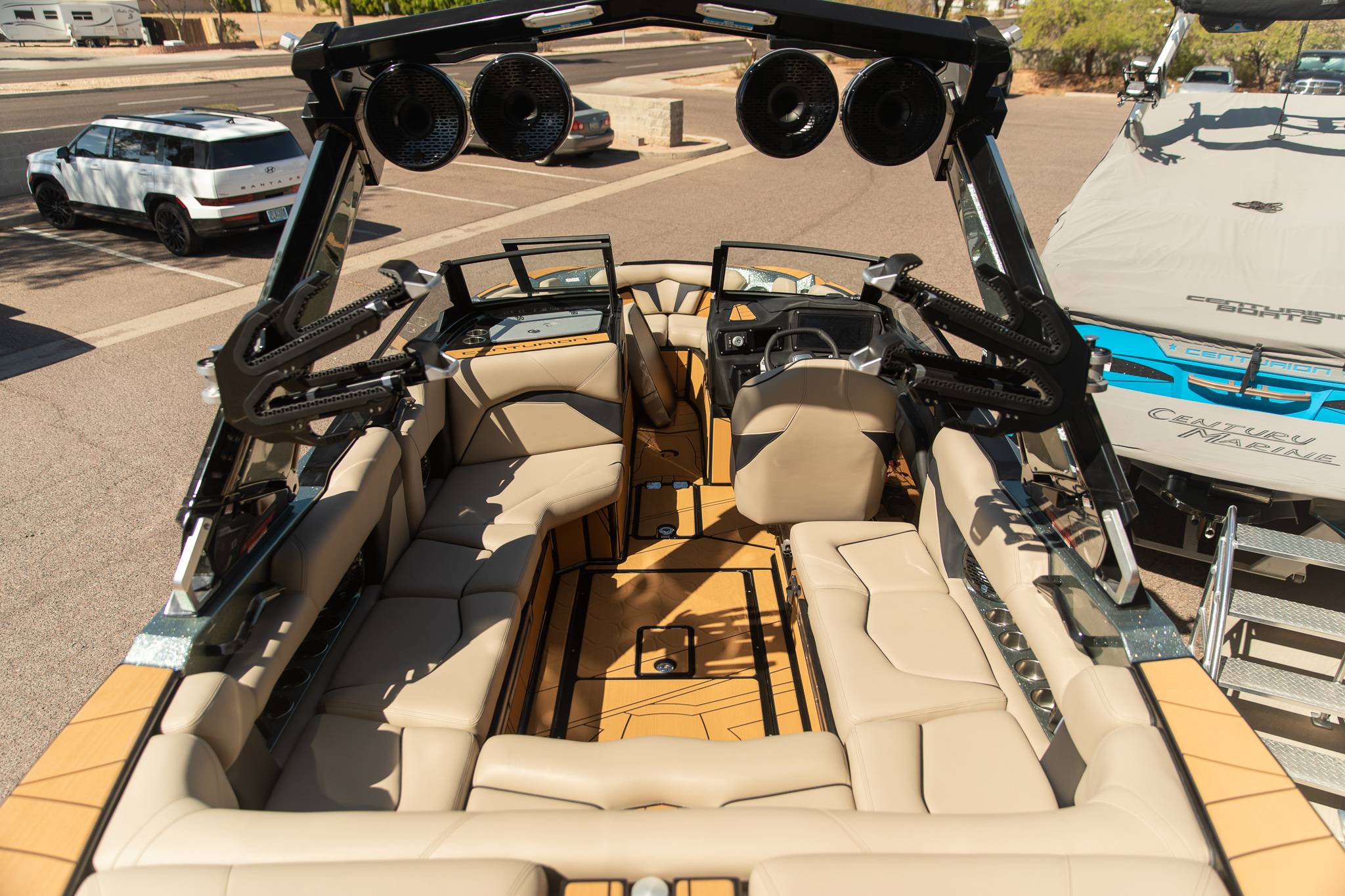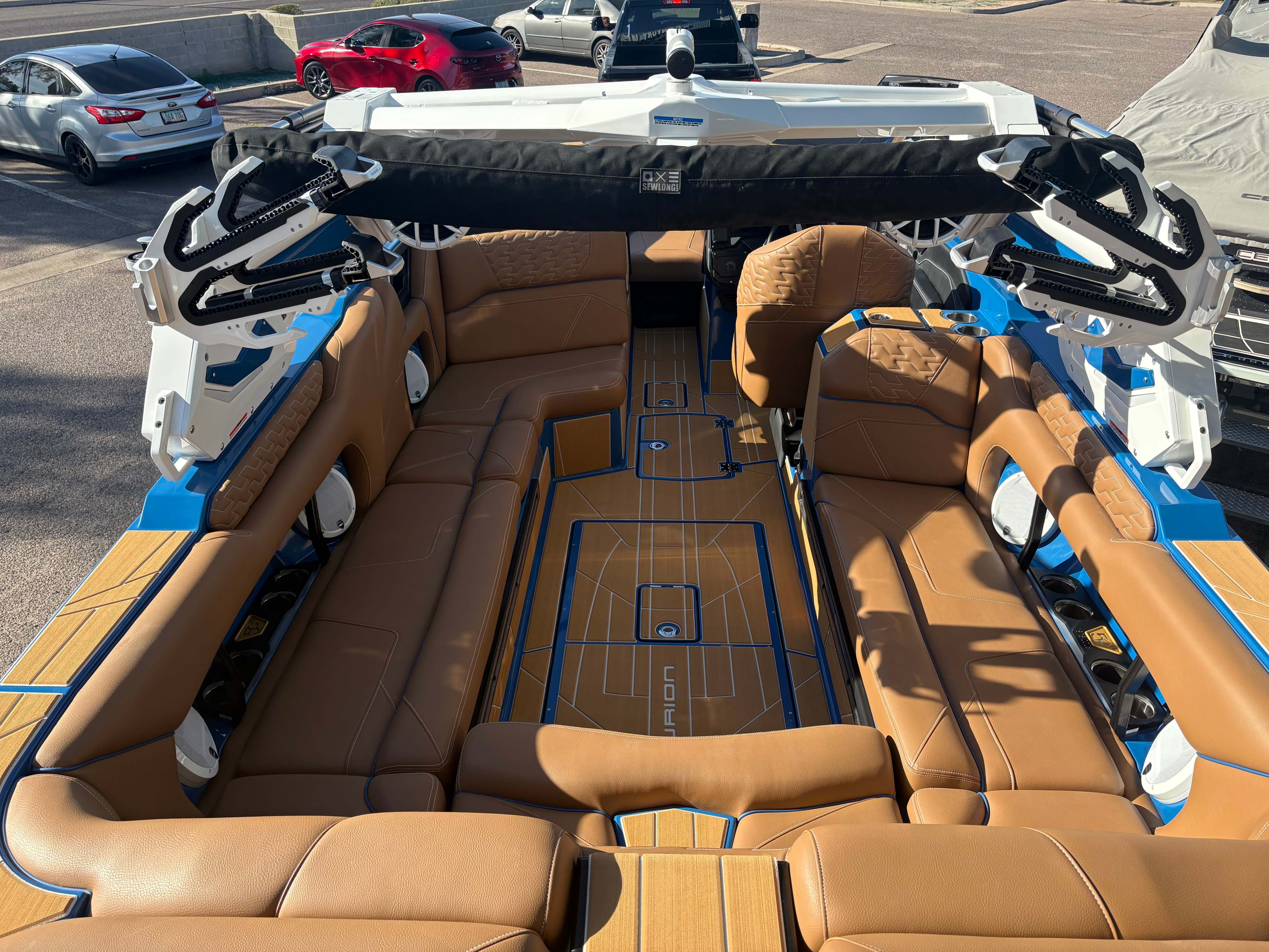 2026 Centurion Ri245 - Marina Blue/Castano Brown The Ri245 hits the sweet spot for advanced wave and wake sports enthusiasts with a 24.5’ powerhouse that excels in performance and comfort. Features: - Up to 5,400 LBS of ballast - Powered by PCM ZZ6 6.2L engine - Surge Thruster - Predator Power Folding Tower -Sewlong Bimini - Ram Fill 2.0 technology for rapid ballast filling and draining - Efficient fuel consumption with live fuel economy readouts - Transom Remote - 6 Way Power-Adjustable Seat -Flip up Interior Seating - Bombshell 2.0 Strapless Board Racks - Flip Up Interior Port Stadium Seating - Interior and Underwater RGBW Lights - Triple Axle Trailer -Front Boarding Ladder w/ Handrails GENERAL SPECS Length: 24.5' Beam: 102" Factory Ballast: 5,650 lbs. Draft: 36" Fuel Capacity: 89 gal Weight: 5,700 lbs Weight on Trailer: 7,300 lbs Seating Capacity: 16 People + Max Ballast Century Marine : (480)-835-9134 3302 E Main St Mesa, AZ 85213