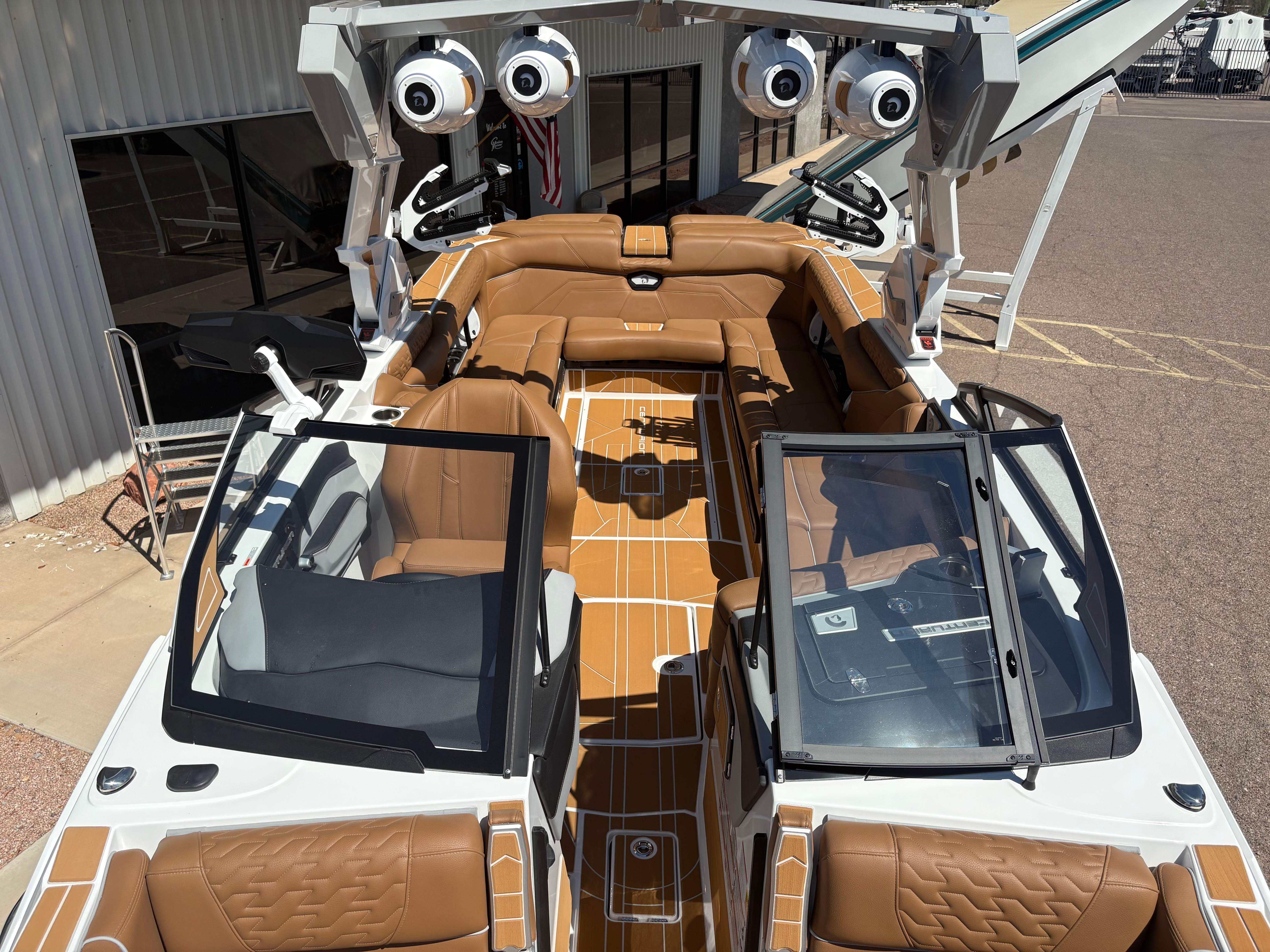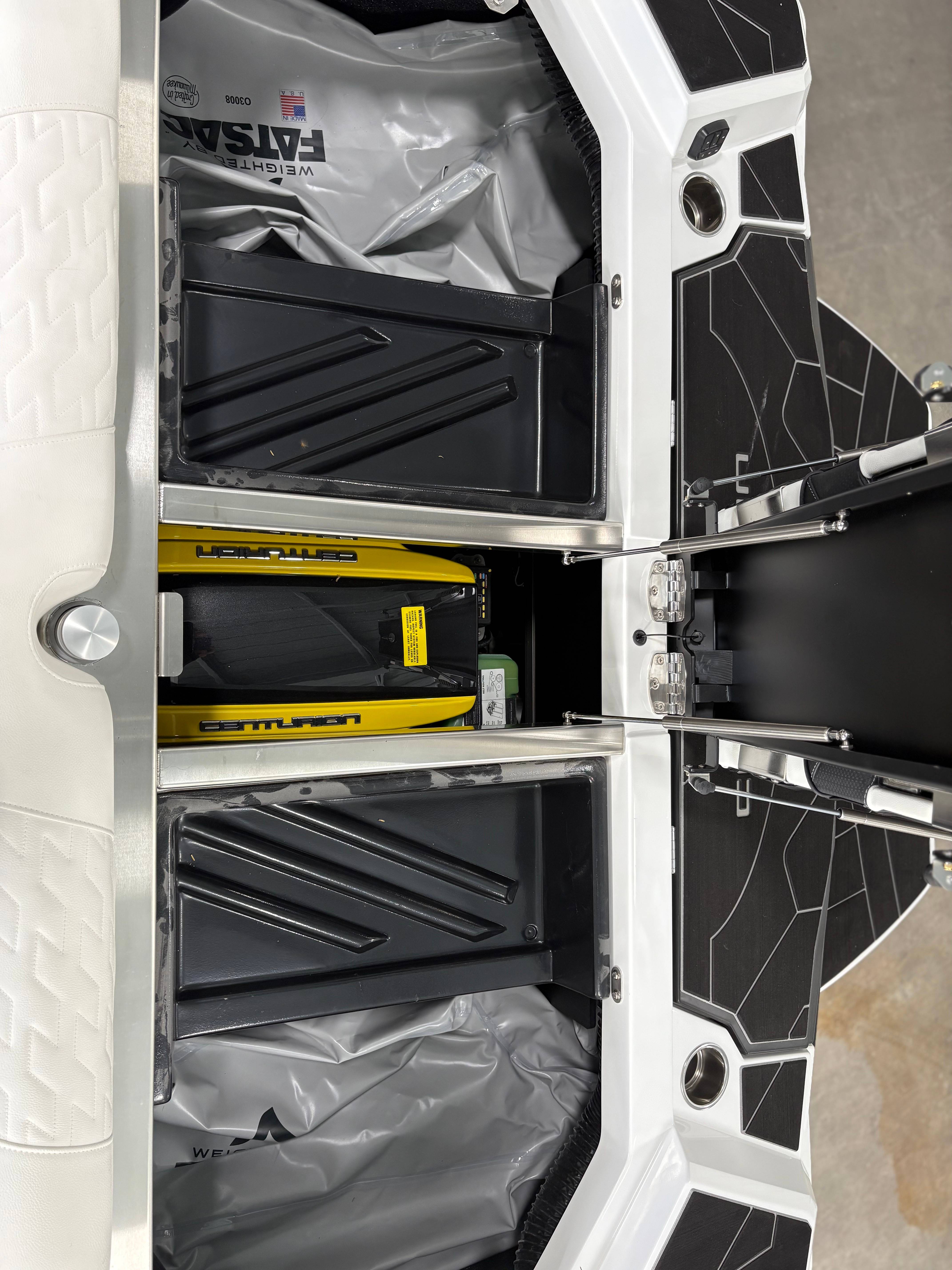 2026 Centurion Ri245 - White Frost/Castano Brown The Ri245 hits the sweet spot for advanced wave and wake sports enthusiasts with a 24.5’ powerhouse that excels in performance and comfort. Features: - 5,250 LBS of ballast - Powered by PCM ZZ6 6.2L engine - Surge Thruster - Predator Power Folding Tower -Roswell Convertible Bimini - Ram Fill 2.0 technology for rapid ballast filling and draining - Efficient fuel consumption with live fuel economy readouts - Transom Remote - Bow Arm Rests -Slide Seat Lean Back - Bombshell 2.0 Strapless Board Racks - Flip Up Interior Port Stadium Seating - Interior and Underwater RGBW Lights - Triple Axle Trailer -Front Boarding Ladder w/ Handrails GENERAL SPECS Length: 24.5' Beam: 102" Factory Ballast: 5,250 lbs. Draft: 36" Fuel Capacity: 89 gal Weight: 5,700 lbs Weight on Trailer: 7,300 lbs Seating Capacity: 16 People + Max Ballast Century Marine : (480)-835-9134 3302 E Main St Mesa, AZ 85213