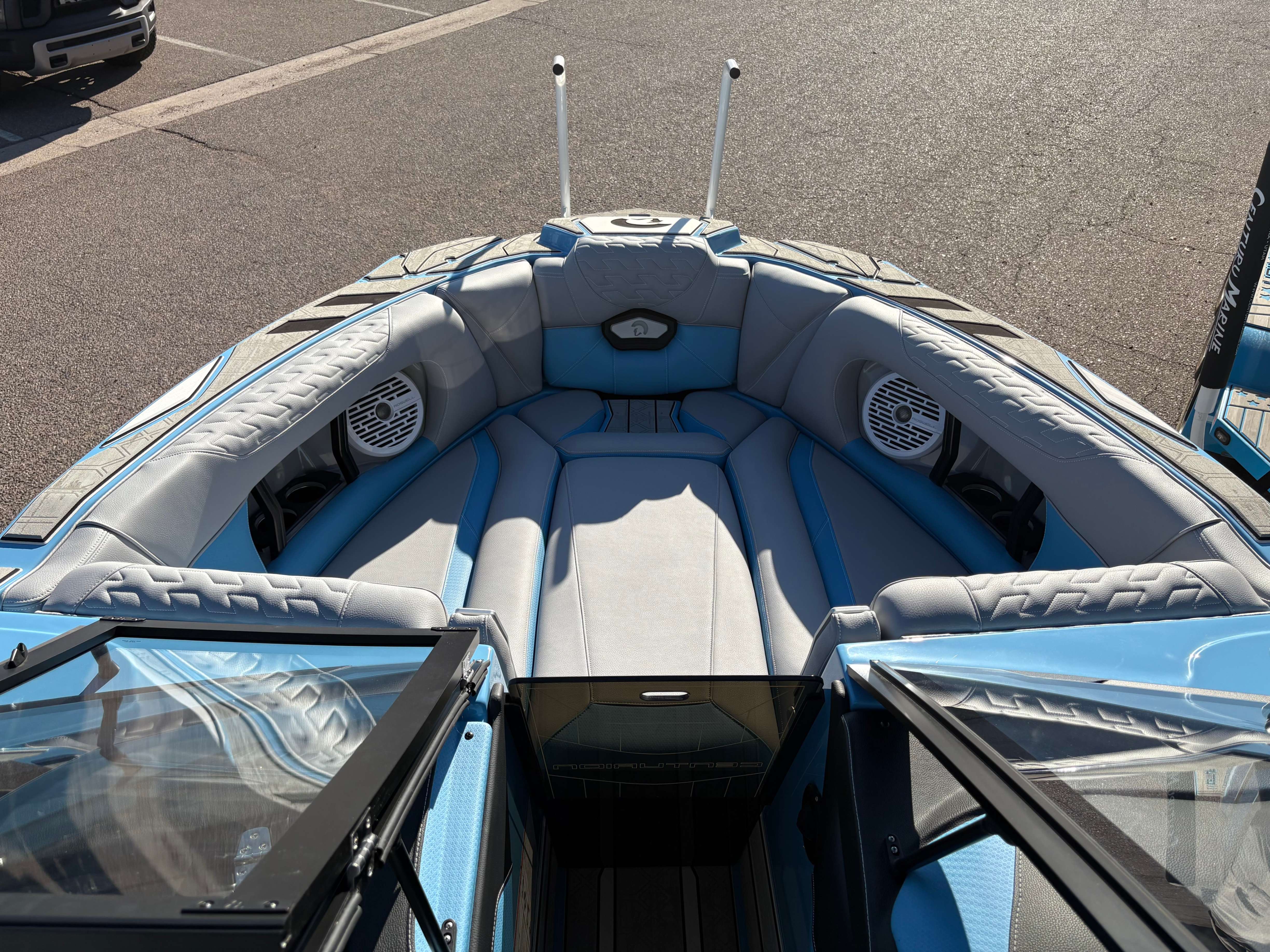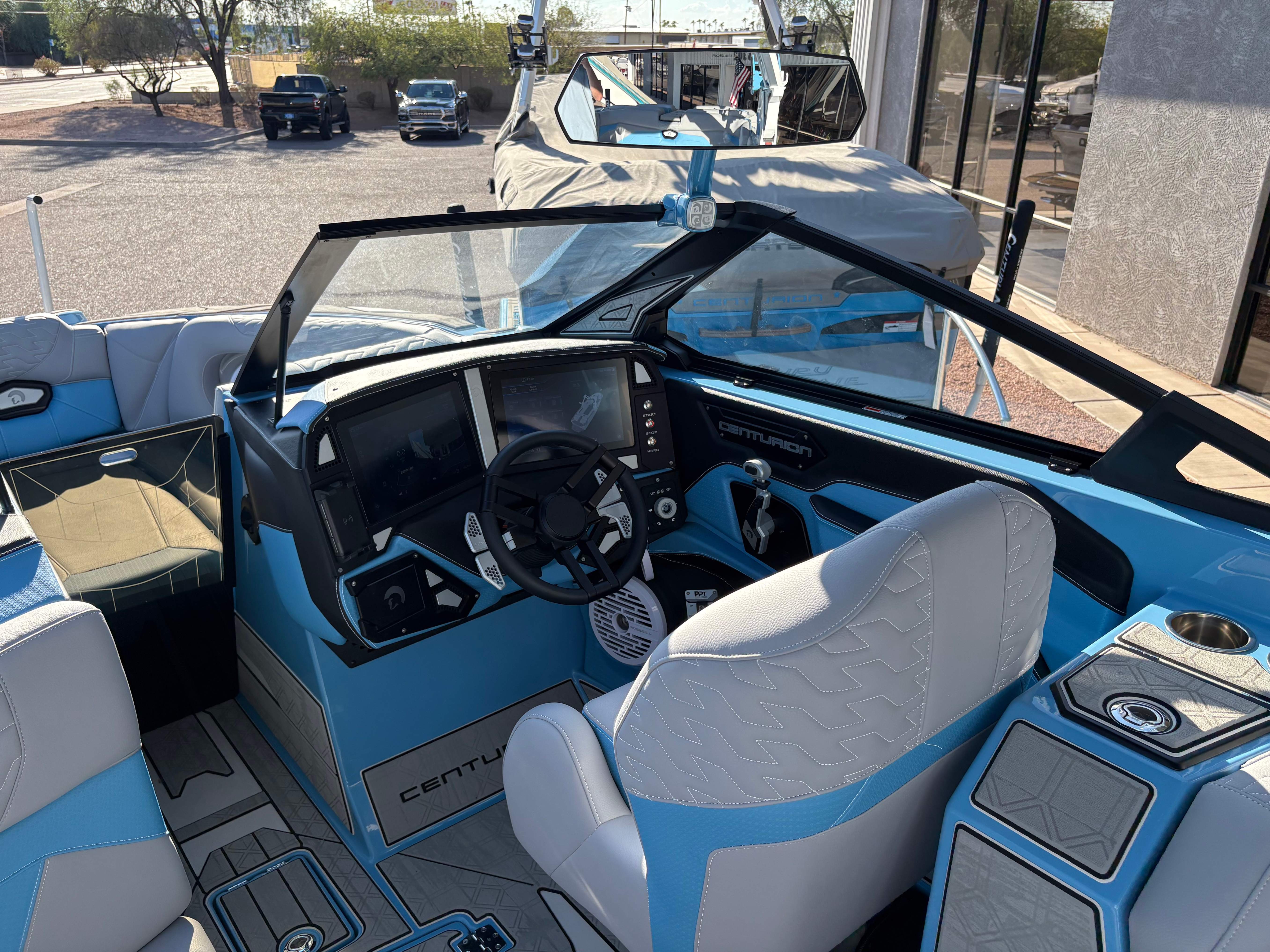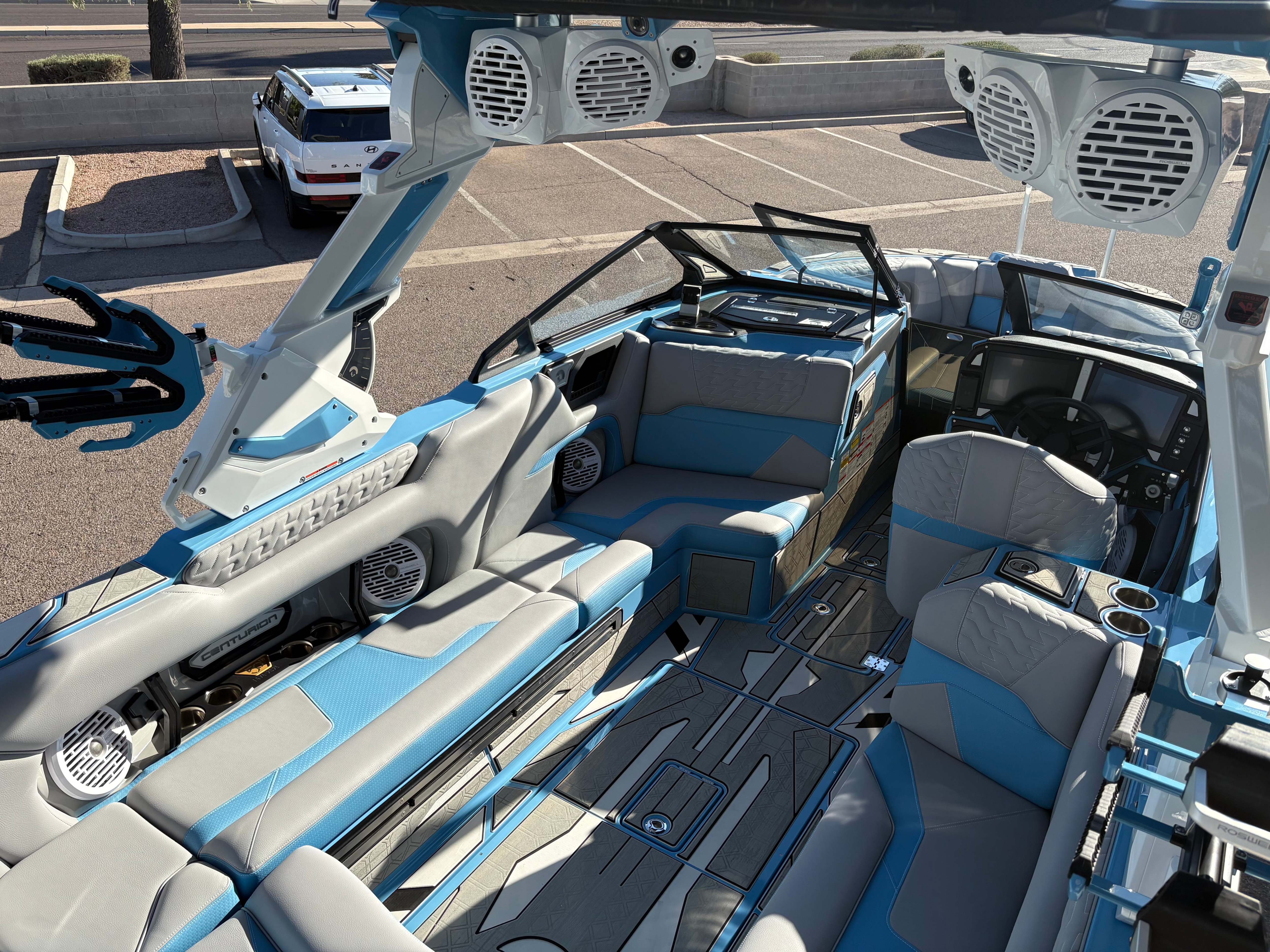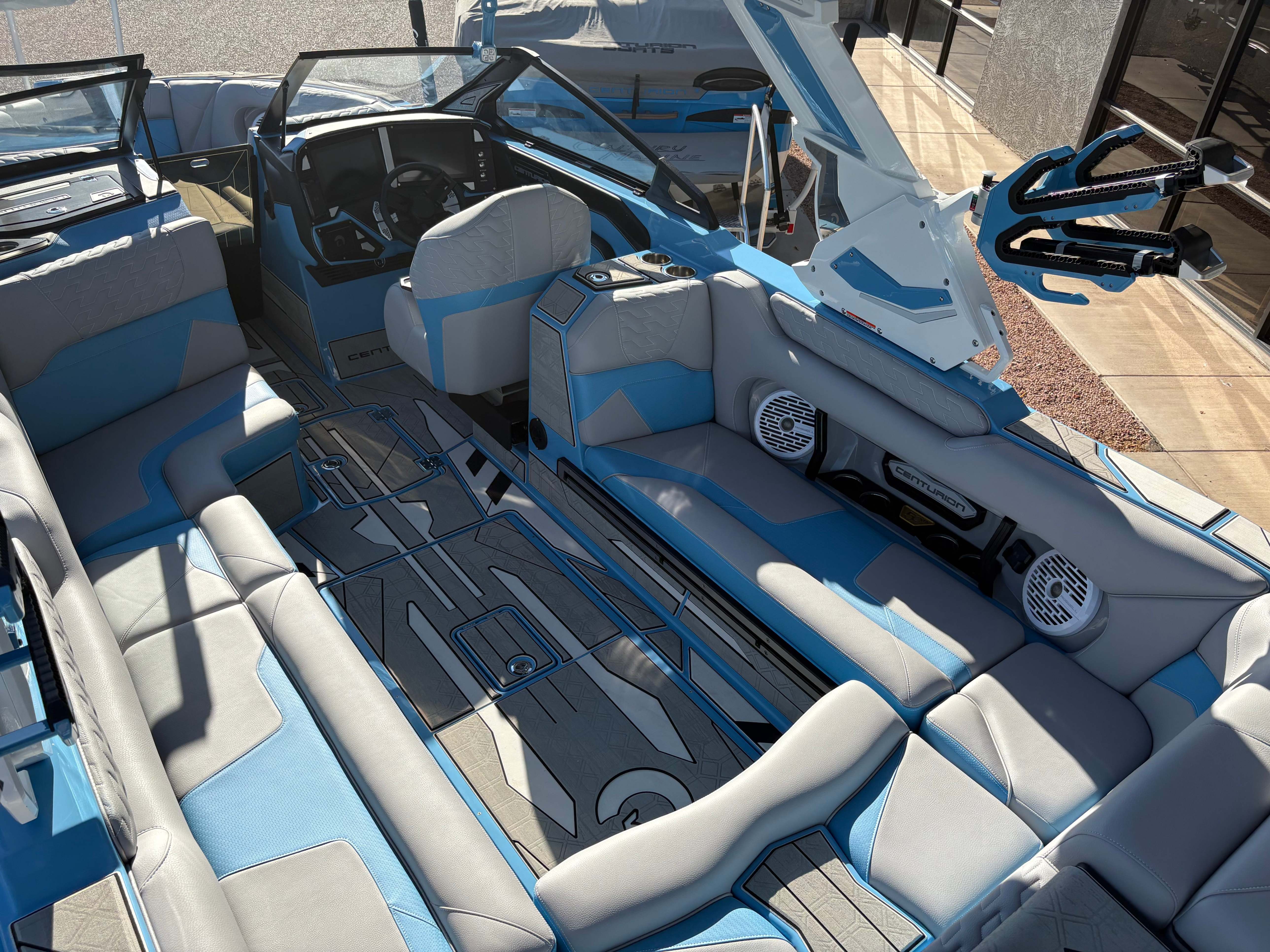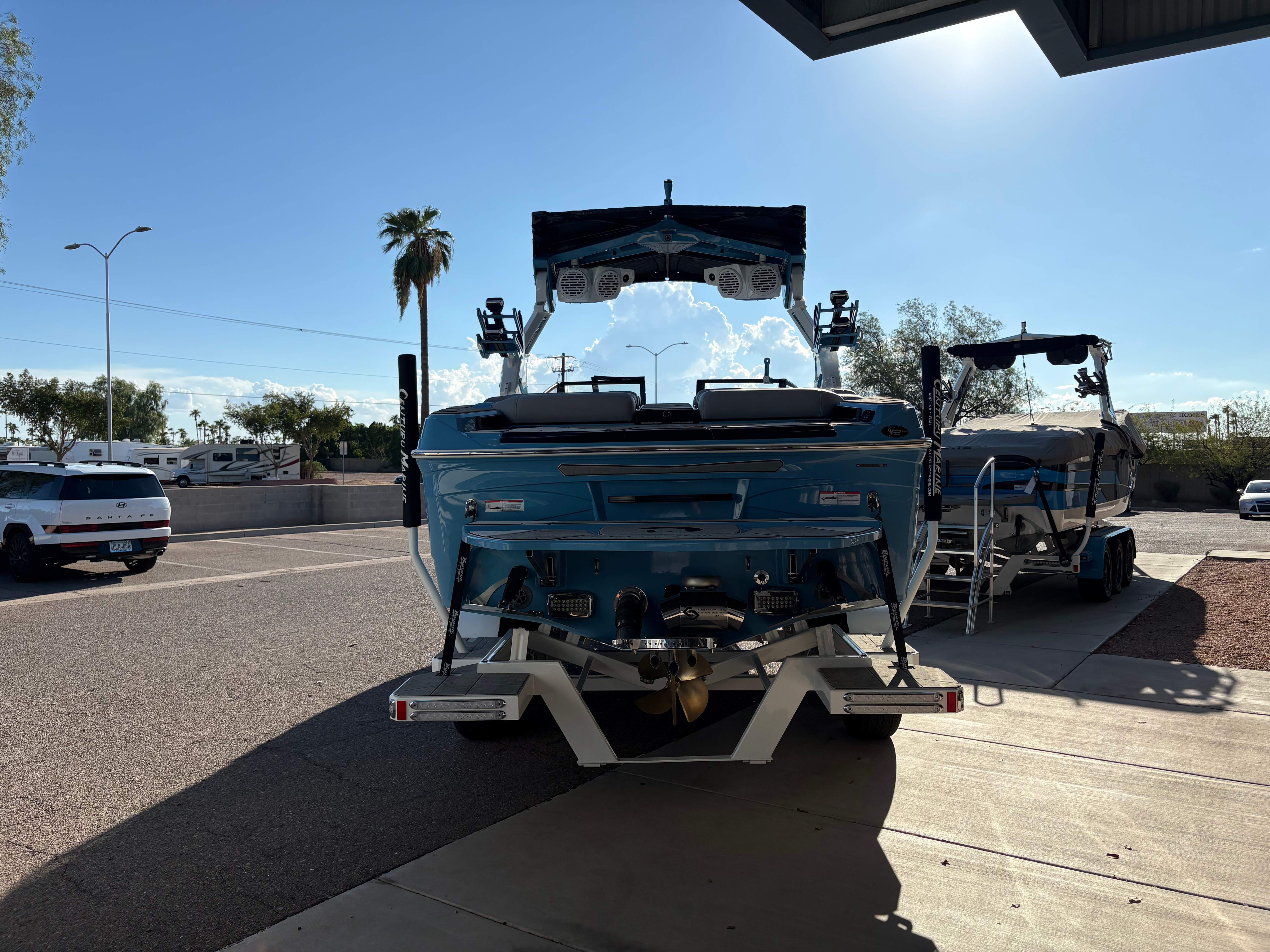 2026 Centurion Ri245 - Mist Blue/Stone Grey The Ri245 hits the sweet spot for advanced wave and wake sports enthusiasts with a 24.5’ powerhouse that excels in performance and comfort. Features: - Up to 5,400 LBS of ballast - Powered by PCM ZZ6 6.2L engine - Surge Thruster - Predator Power Folding Tower - Ram Fill 2.0 technology for rapid ballast filling and draining - Efficient fuel consumption with live fuel economy readouts - Transom Remote - 6 Way Power-Adjustable Seat - Bow Arm Rests - Bombshell 2.0 Strapless Board Racks - Flip Up Interior Port Stadium Seating - Grizzly G40 40qt Ice Chest w/ Matching Gator Step - Interior and Underwater RGBW Lights - Triple Axle Trailer -Front Boarding Ladder w/ Handrails GENERAL SPECS Length: 24.5' Beam: 102" Factory Ballast: 5,650 lbs. Draft: 36" Fuel Capacity: 89 gal Weight: 5,700 lbs Weight on Trailer: 7,300 lbs Seating Capacity: 16 People + Max Ballast Century Marine : (480)-835-9134 3302 E Main St Mesa, AZ 85213