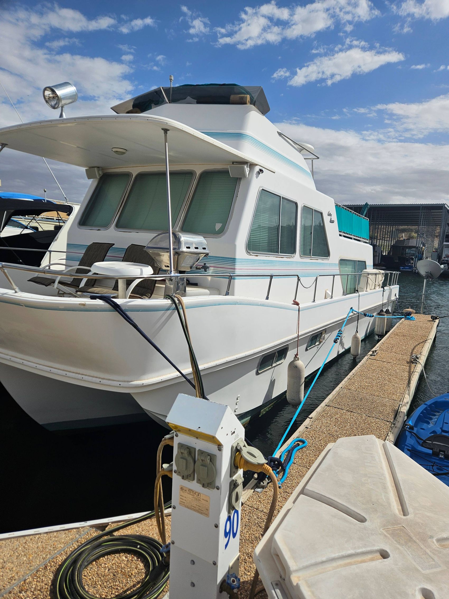 Seize the chance to own this incredible vessel and create lasting memories on the water. Envision the countless sunrises and sunsets awaiting you, and make this dream a reality with the purchase of this exceptional home on the lake. This vessel is well equipped with twin 5.0 260 HP Volvo Penta fresh water cooled engines with approximately 300 hours. It comes with a Kohler 6.5 KW generator with approximately 264 hours. It has 60 gallons of fresh water and 180 gallon capacity fuel tanks. It has a Sony AM/FM/CD player and a 21” Toshiba TV/DVD/ VCR combo. Kitchen has been completely remodeled with brand new appliances including; a 3 burner stove, microwave and a refrigerator. There are 2 A/C units with one of them being portable. On the upper deck there is a teal canvas bimini and with a remote spot light. The boat has a VHF ship to shore radio, a Raymarine Dragon Fly Pro, Lowrance 3500 depth finder and a Norcross depth finder.