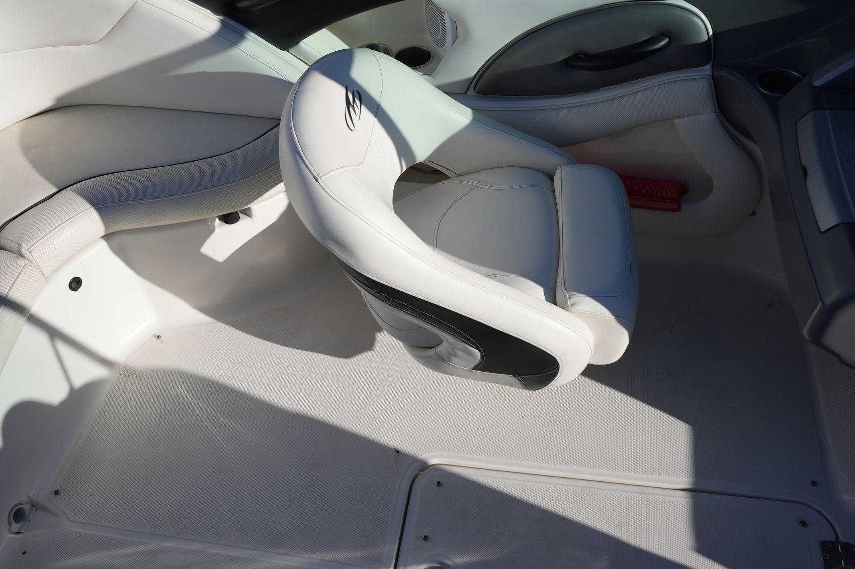 The gelcoat is in great shape with nothing alarming or concerning, and the interior upholstery shows no rips or tears. Seating is comfortable and spacious, making this an ideal boat for families looking to get into the watersports lifestyle. The trailer is included and in great condition.