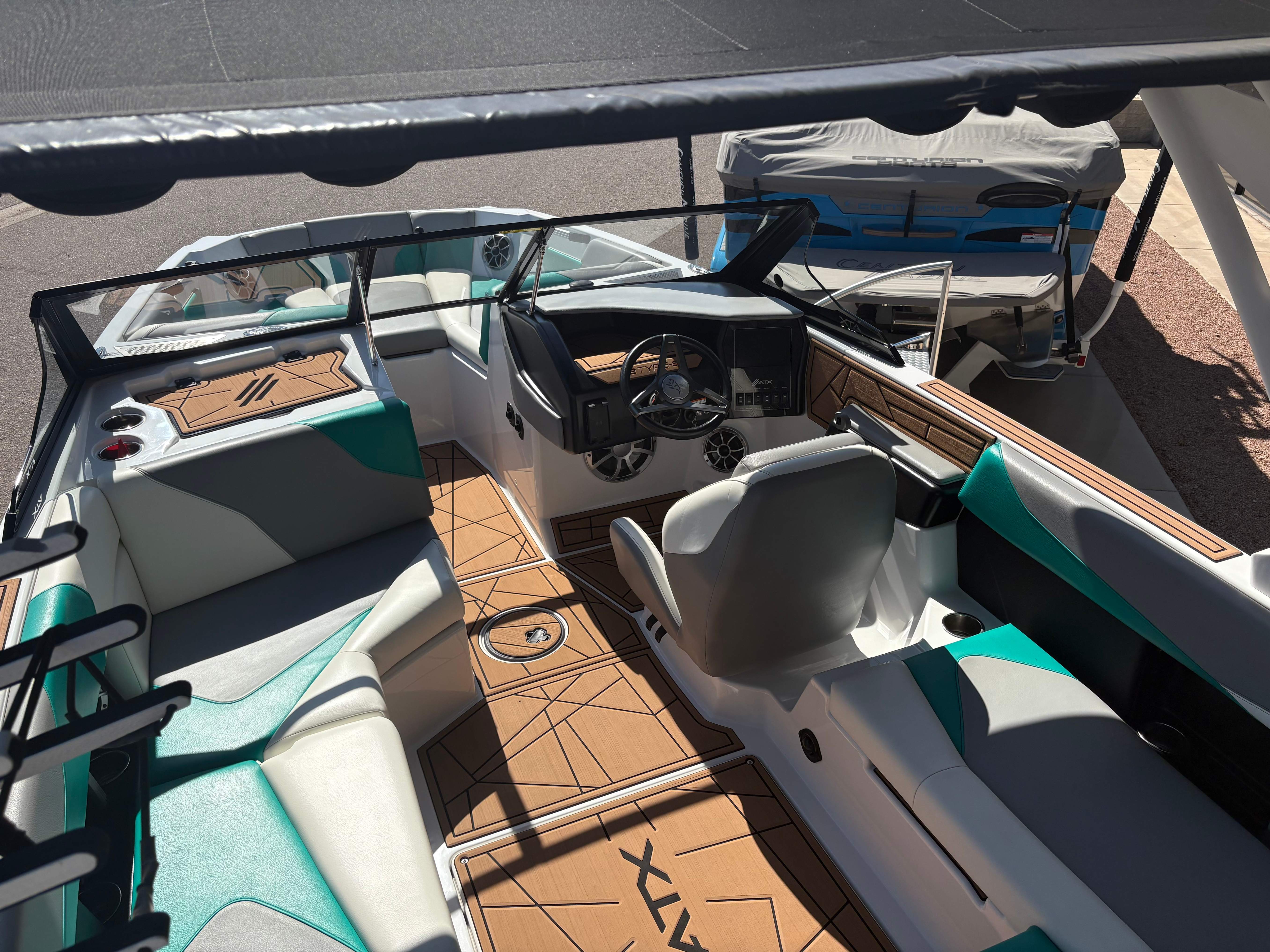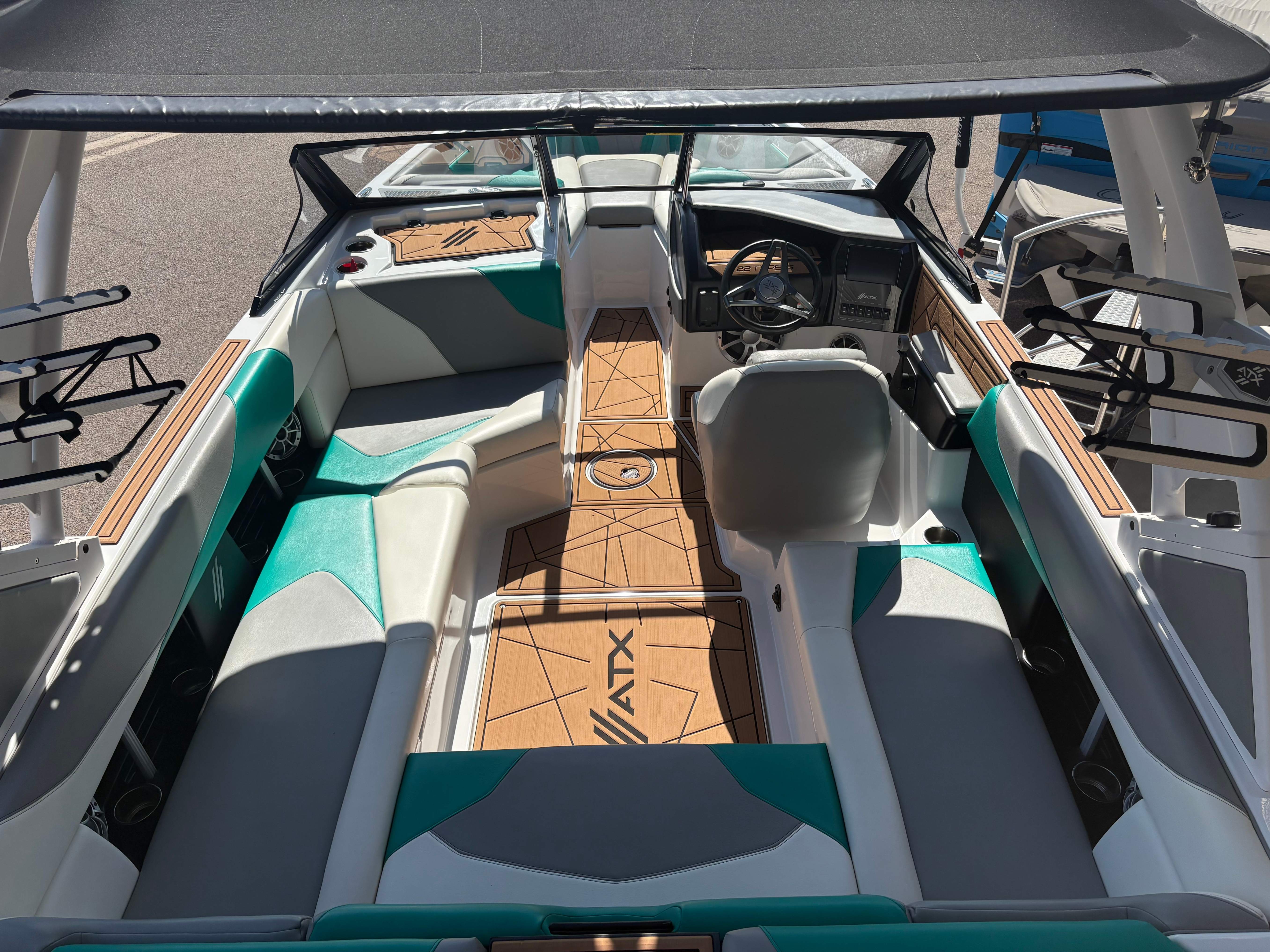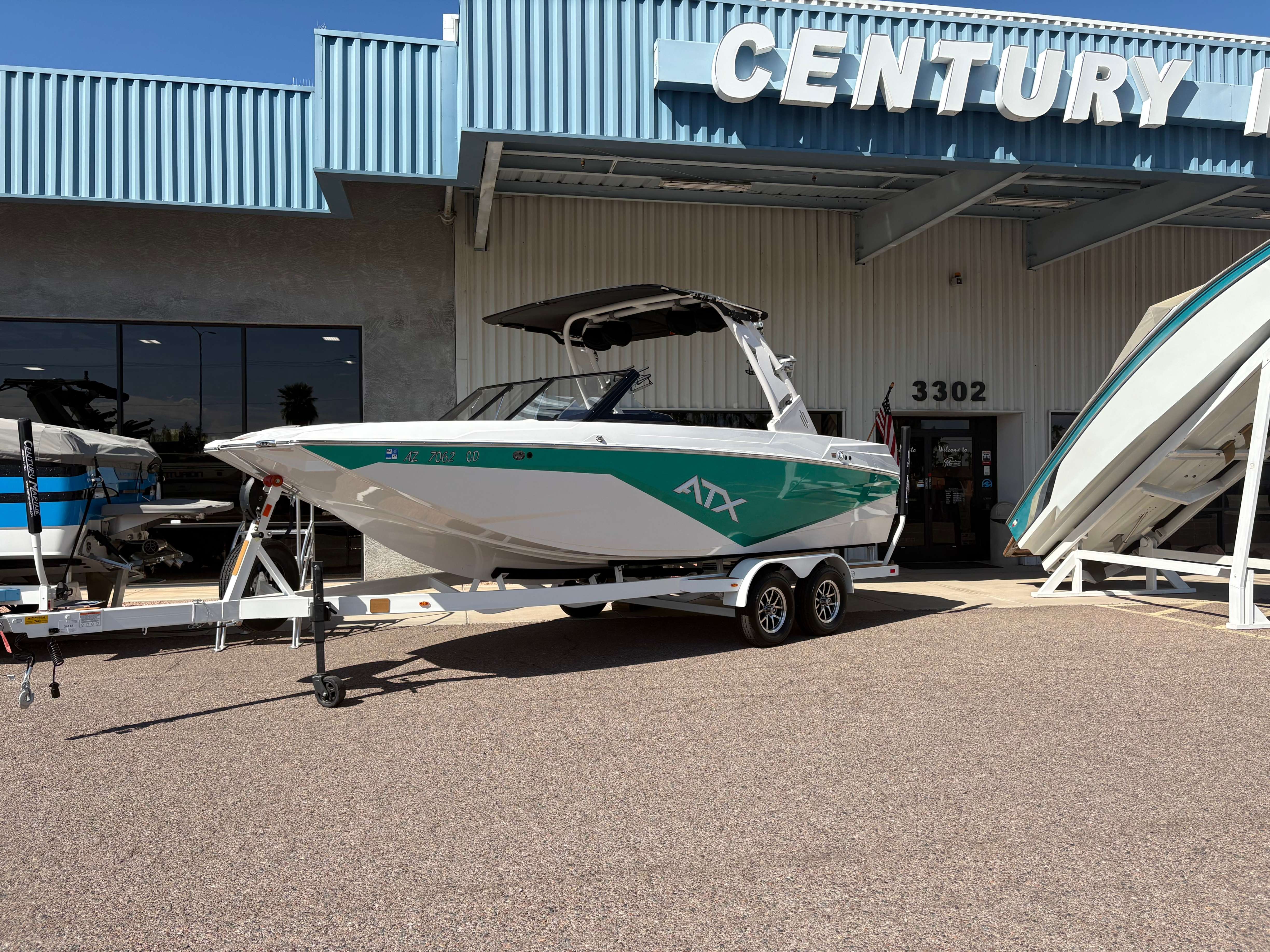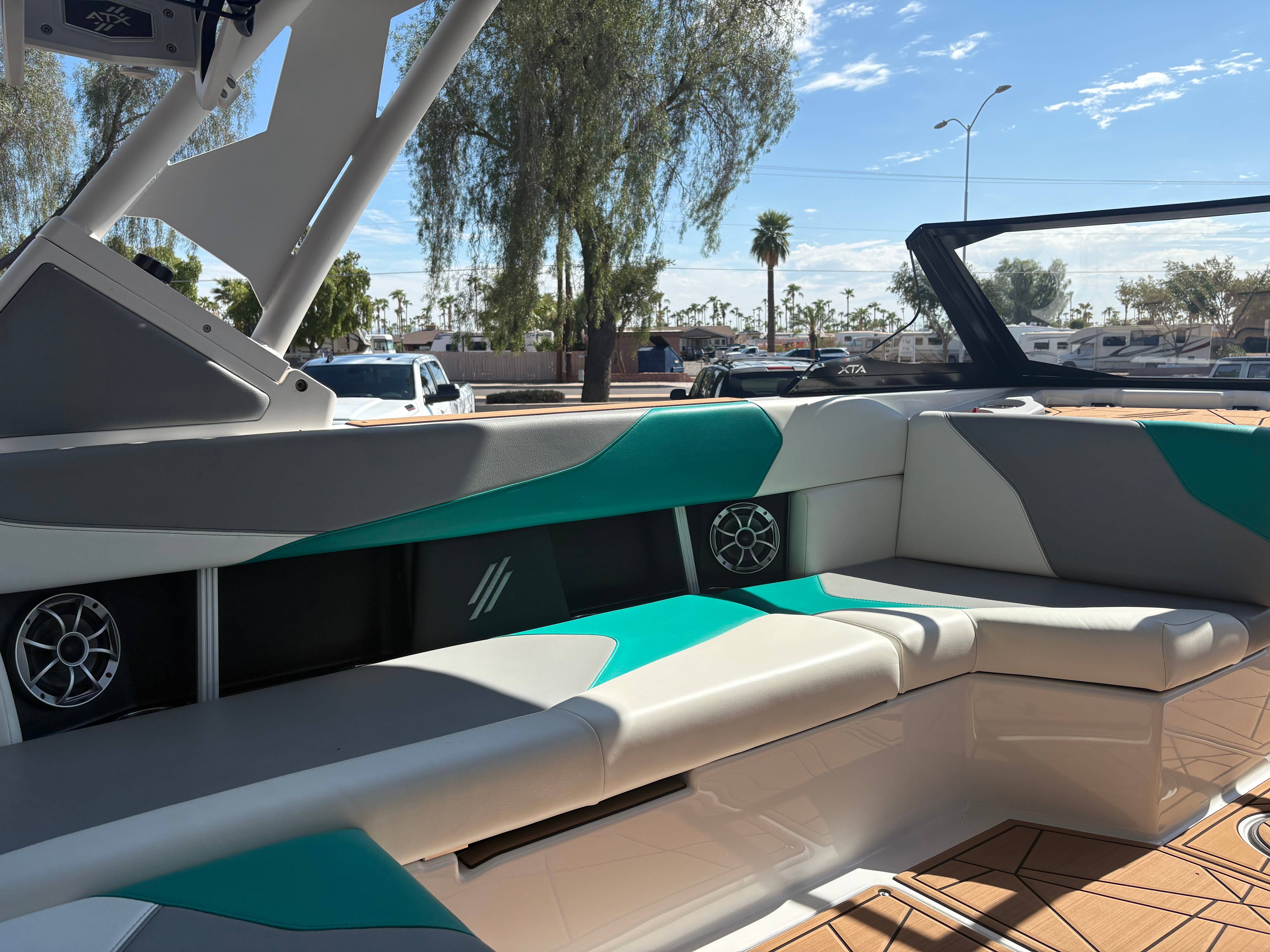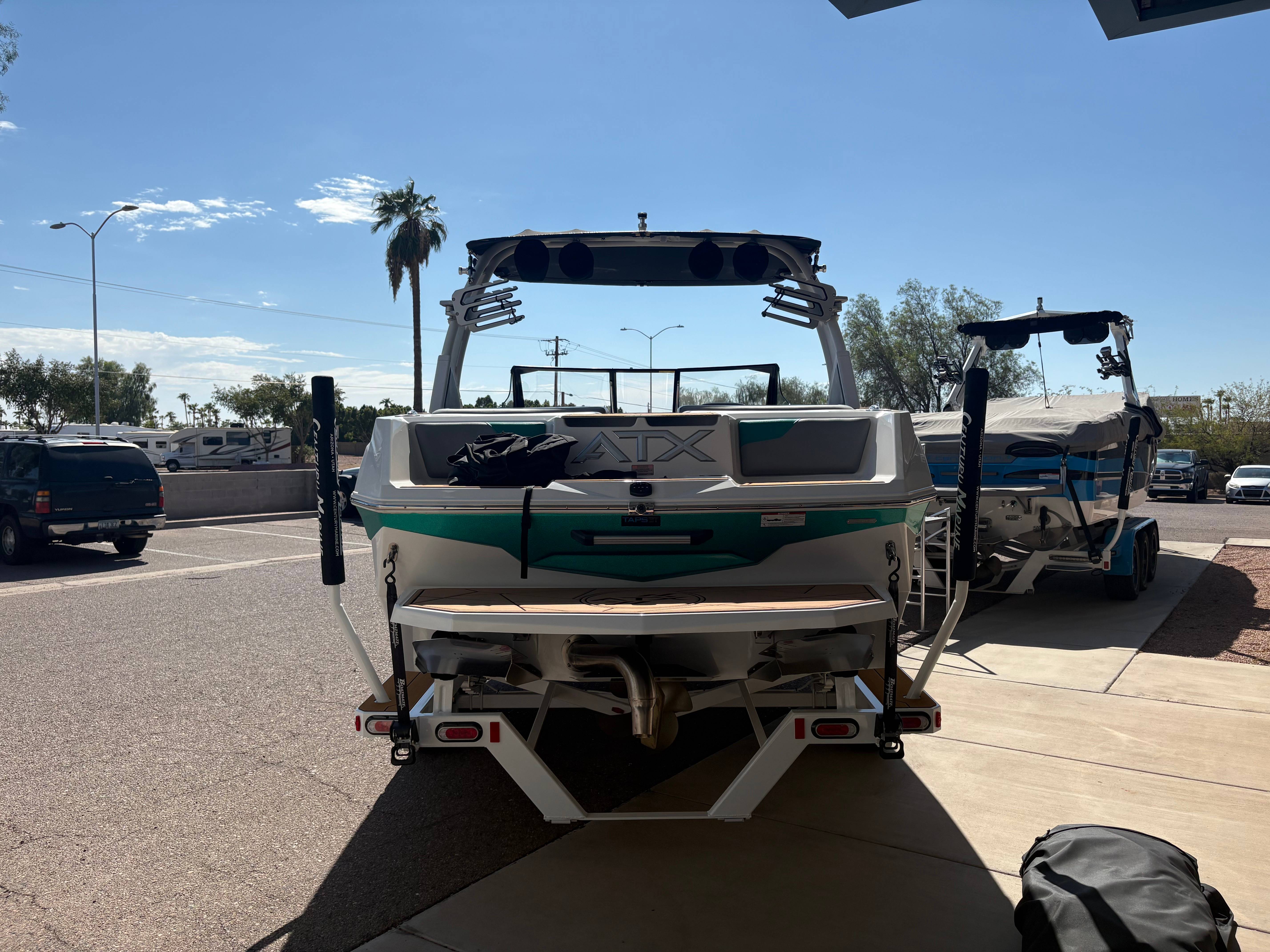 2022 ATX 22 Type S- White/Green Discover Unmatched Adventure with ATX Boats Craftsmanship Beyond Compare: ATX Boats are built with precision and passion. Every detail is thoughtfully designed to ensure you experience the highest level of performance and comfort on the water. Specs: Hours: 82 Length: 22' Beam: 102" Weight: 5,500 lbs Ballast: 3250 lbs Fuel Capacity: 57 gal Seating: 15 Weight W/ Trailer: 7,000 lbs Options: ATX 7" Touch Screen Surf + Wake Ballast Gator Step Flooring Stainless Cup Holders InCharge Phone Holder Bungee Board Racks ATX Bimini w/ Surf Storage GO! System with TAPS 3T 4 Tower Speakers Rear Camera Century Marine (480)-835-9134 3302 E Main St Mesa, AZ 85213